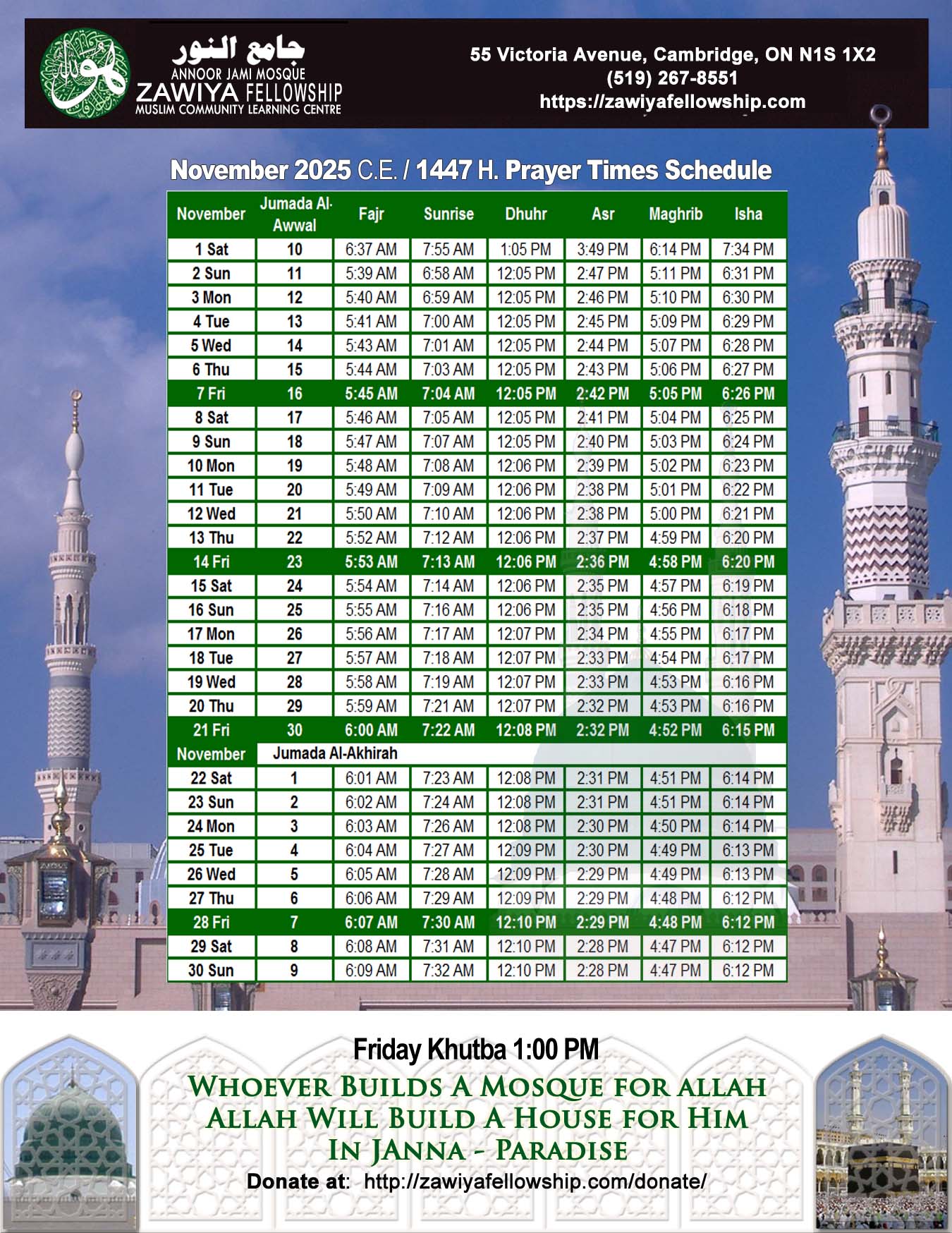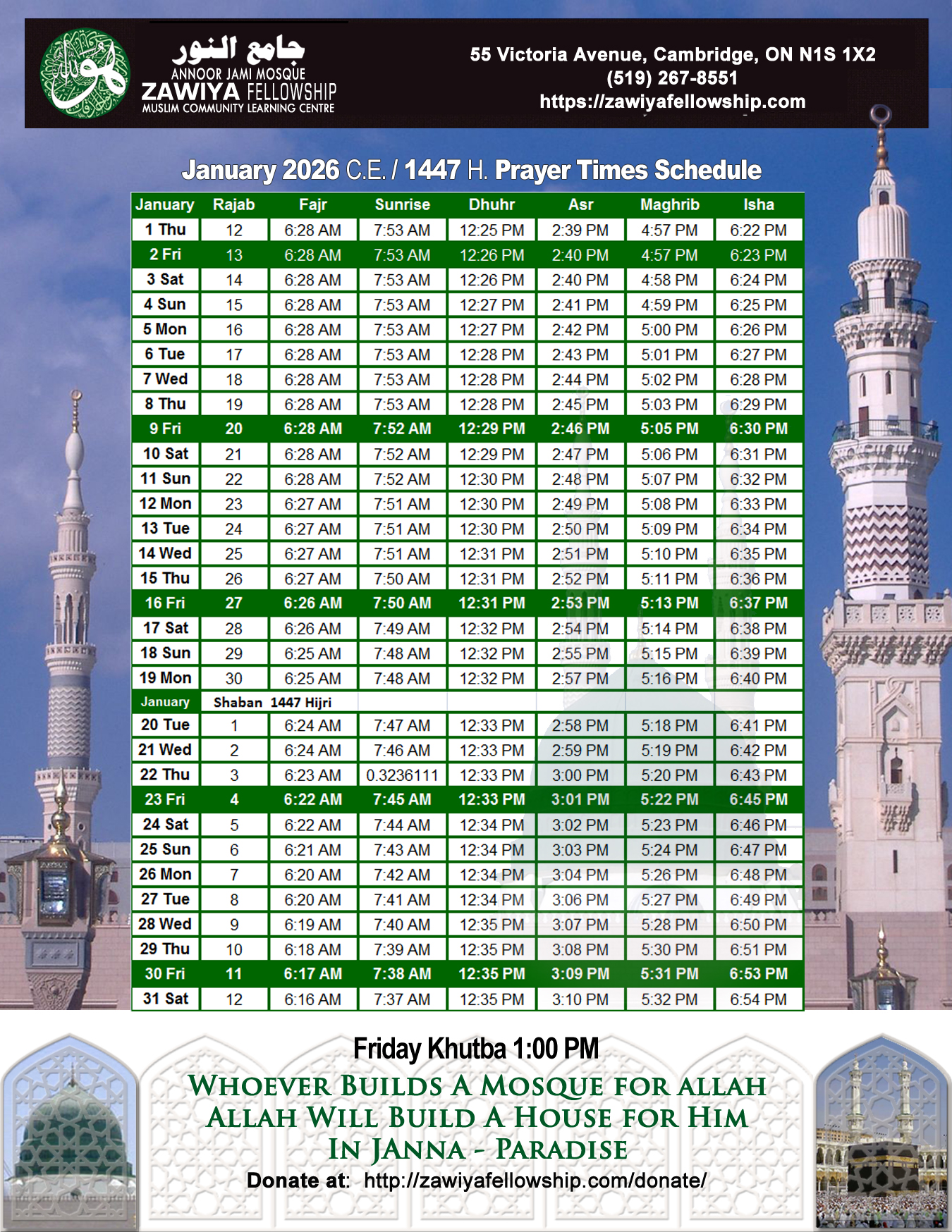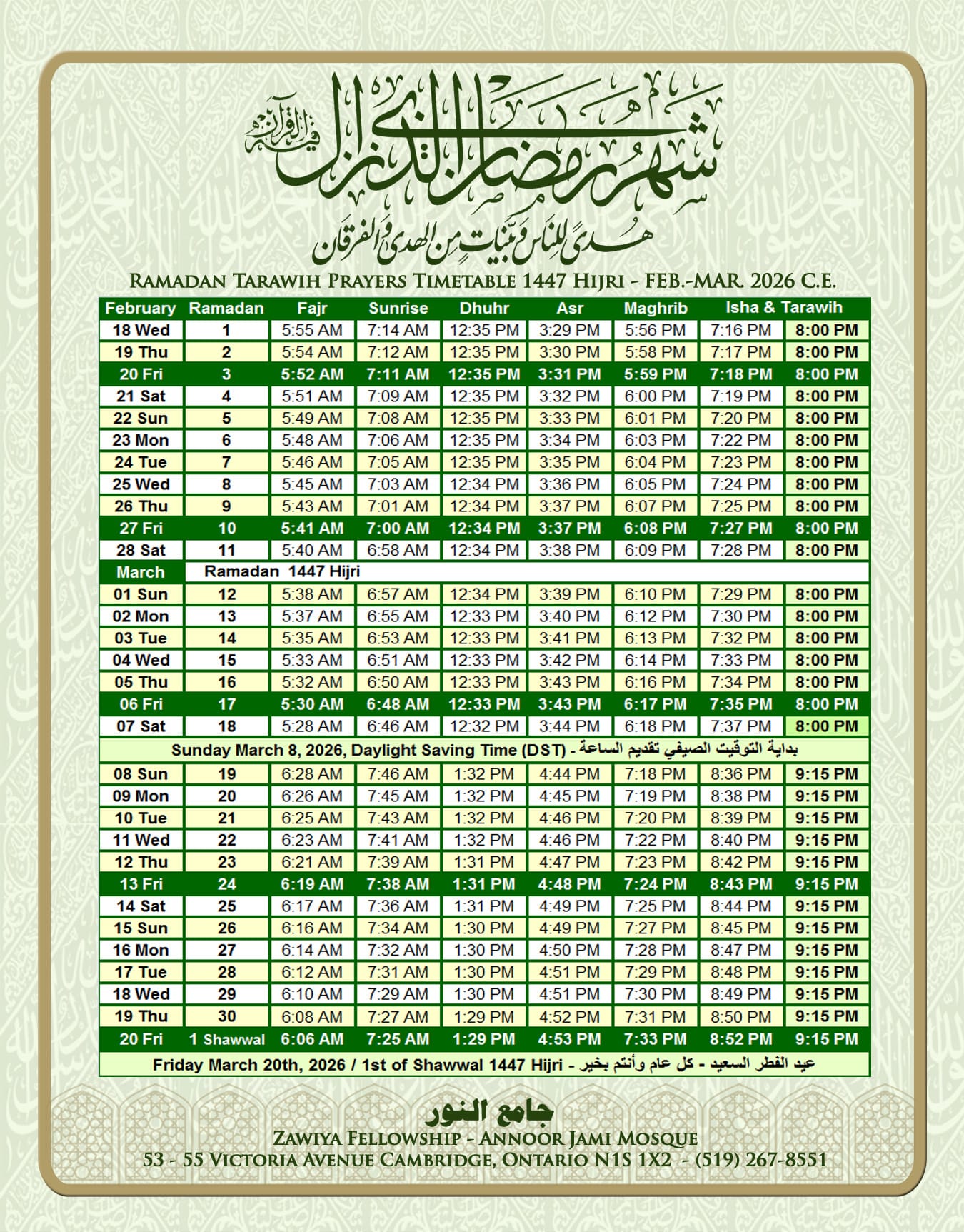ستكون صلاة الظهر يومياً الساعة الواحدة ظهراً إن شاء الله